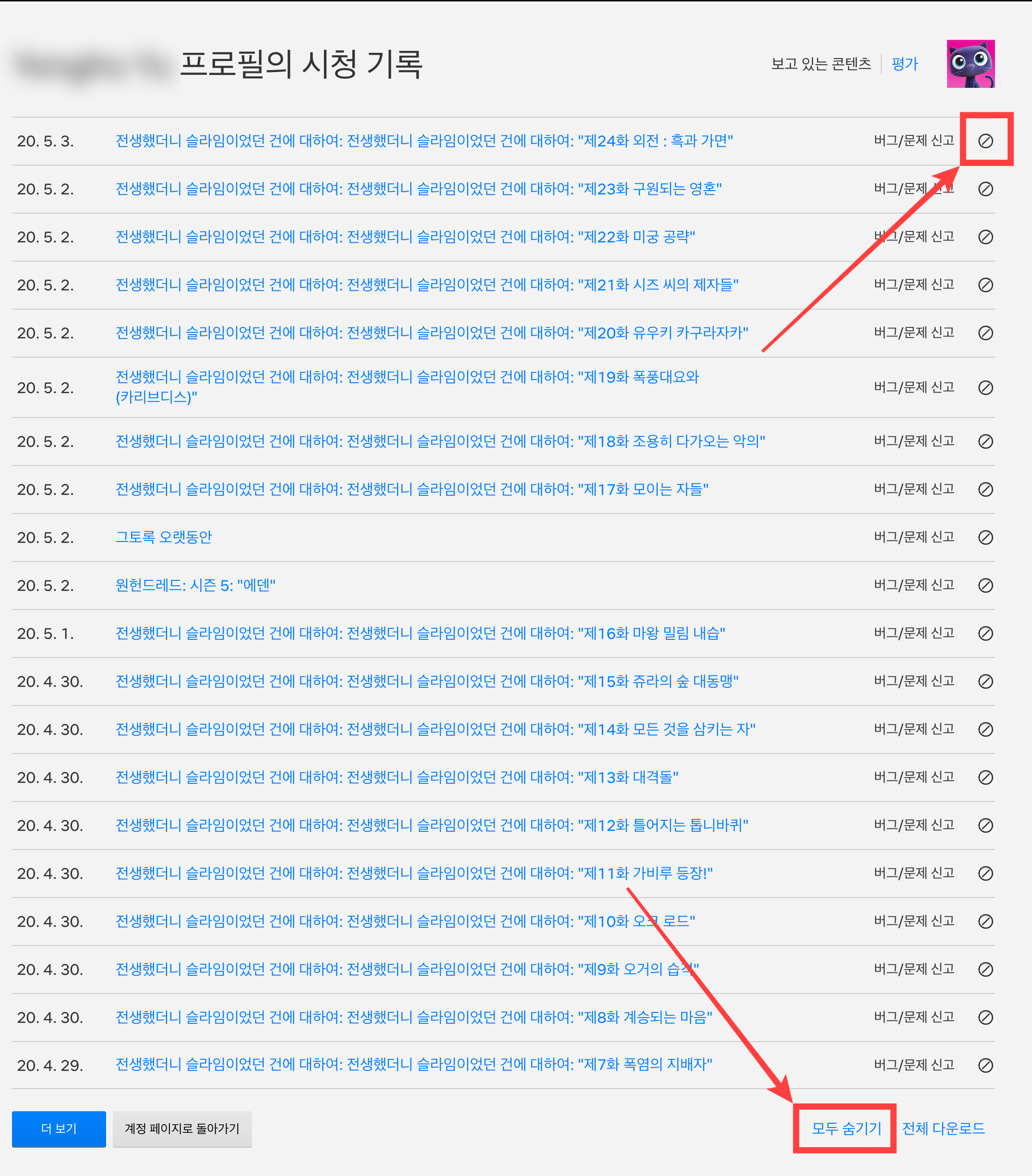 삭제하고자 하는 콘텐츠의 숨기기 버튼을 클릭합니다. 전체 숨기기 할 때는 모두 숨기기 버튼을 클릭하세요.