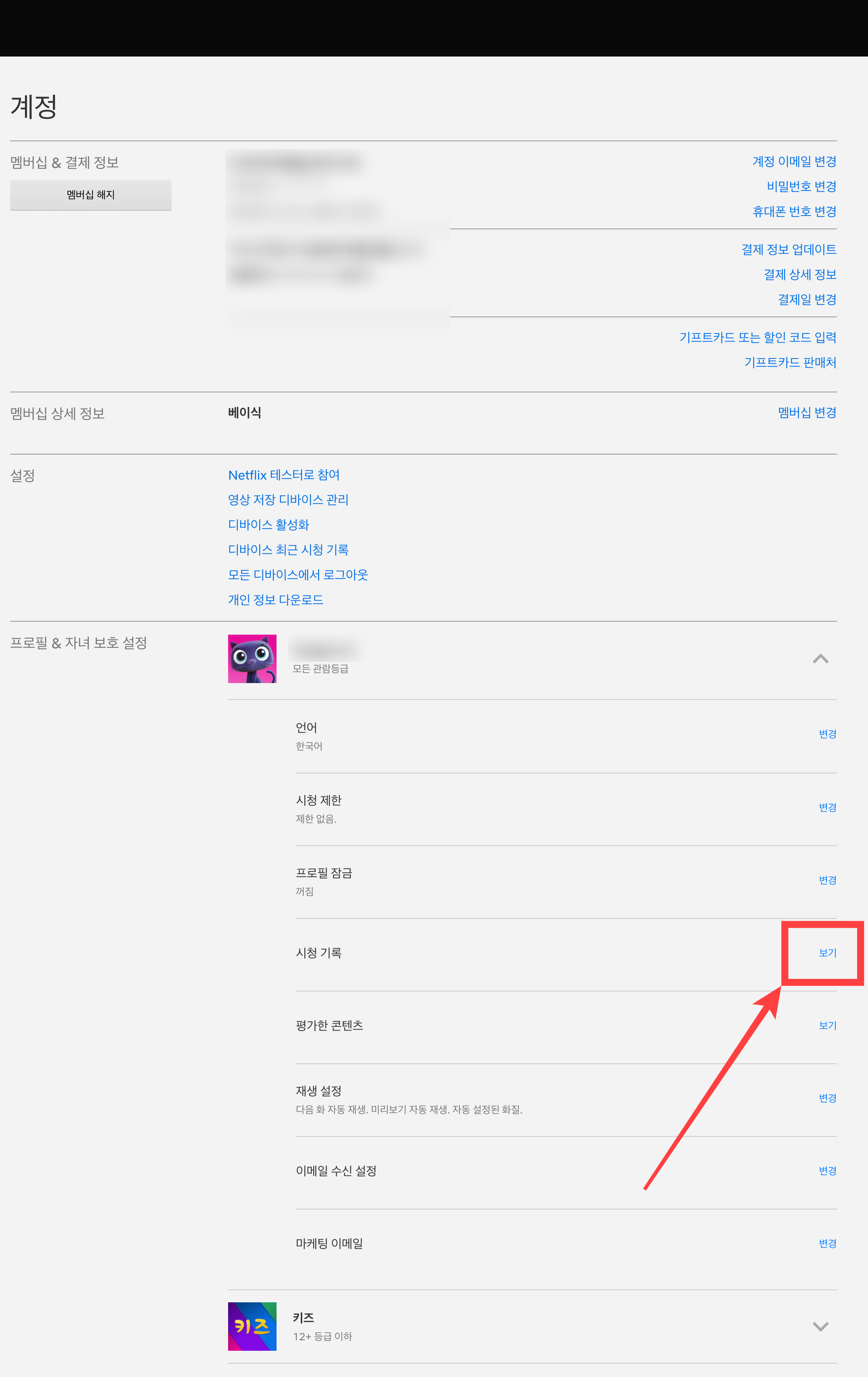 시청기록 메뉴의 보기 버튼을 클릭합니다.
